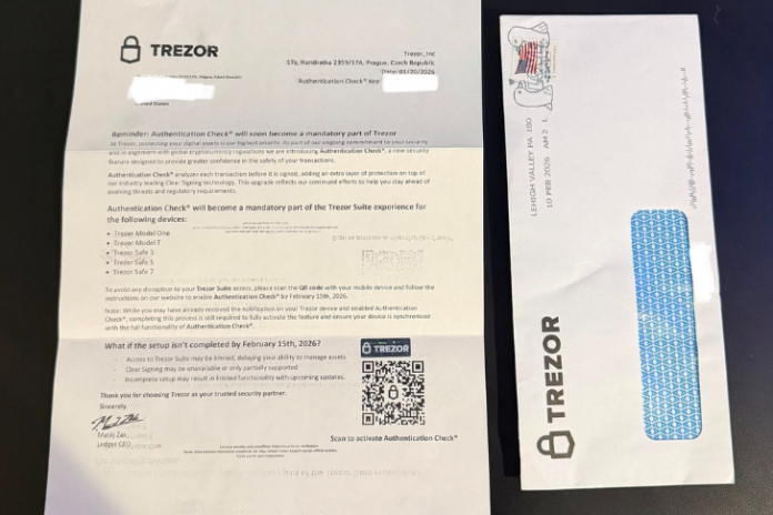 ดมิทรี สไมลีแอนเน็ตส์ ผู้เชี่ยวชาญด้านความปลอดภัยไซเบอร์ ออกมาเปิดเผยเมื่อวันที่ 13 กุมภาพันธ์ 2569 ว่า เขาได้รับจดหมายที่จัดทำเลียนแบบเอกสารทางการได้อย่างสมจริง โดยจดหมายอ้างว่ามาจาก Trezor และระบุให้ผู้ใช้ทำ “Authentication Check” ภายในวันที่ 15 กุมภาพันธ์ มิฉะนั้นอุปกรณ์จะถูกระงับการใช้งาน